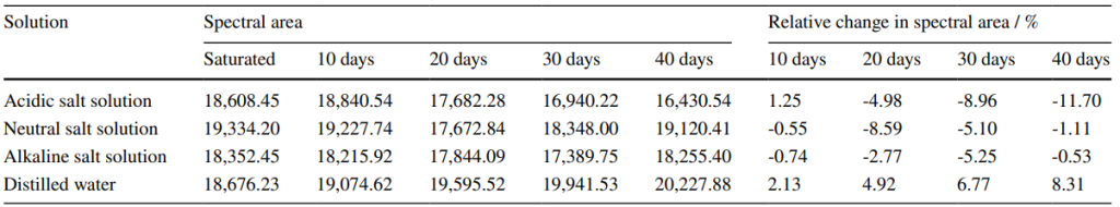 表2展示了不同溶液和浸泡时间(如0天、10天、20天、30天和40天)下T2谱面积的变化率,以及这些变化如何反映孔隙结构的动态变化,有以下分析: