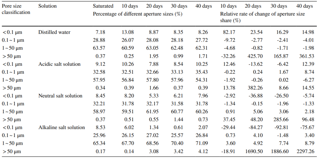 1)孔隙结构变化:不同溶液(如酸性、中性、碱性盐溶液)和浸泡时间(如10、20、30、40天)会导致孔隙数量、大小和连通性变化。例如,酸性溶液可能促进溶解和沉淀,导致孔隙结构复杂化;而碱性溶液可能促进矿物溶解和孔隙扩展。