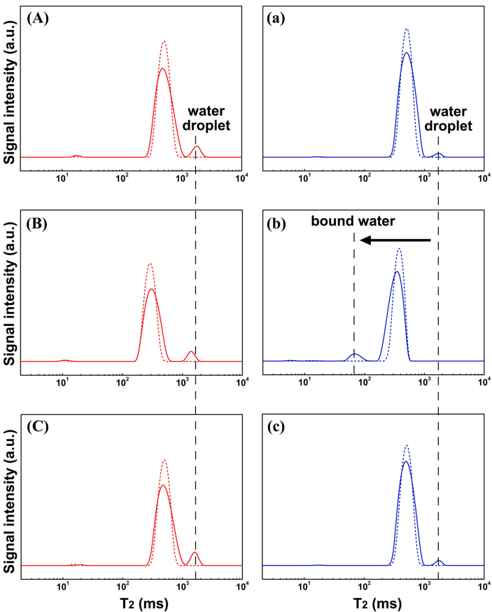 实验中制备了三种体系,为油包盐水乳液,向油包盐水乳液中分别加入亲水颗粒BaSO₄和疏水颗粒PTFE,观察体系中水的弛豫时间分布,通过对比超声前后水弛豫时间的变化,说明油相中水的存在形式。T2弛豫时间分布:超声前(A)油包盐水乳液,向油包盐水乳液加入(B)亲水颗粒BaSO4和(C)疏水颗PTFE。(a–c)为(A–C)对应超声后的体系。颗粒的体积分数为20%。