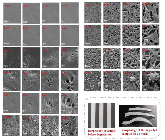 此外,该工作还对不同低聚物含量的聚己内酯材料进行了模拟体液体外浸泡降解评估,发现12.5 wt%含量的试样比含量为4.3% wt%的试样降解速率更快。在降解过程中,12.5 wt%含量的试样相对质量在64周后损失约80%,机械性能在8周时已基本无法进行检测。低聚物含量为4.3% wt%的试样即使降解周期长达64周,其相对分子量仍能保持在12,000。而低聚物含量更高的试样在20周时,其相对分子质量已降至1000以下。