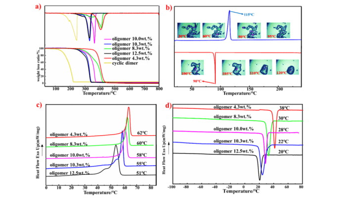通过对不同低聚物含量的聚己内酯进行表征,发现低聚物含量4.3 wt%的试样其熔融、结晶温度分别为62 °C和38 °C,随着低聚物含量上升到12.5wt%,分别降低至51和20 °C。而低聚物含量为4.3wt%的试样其完全分解温度(Td100%)比低聚物含量为12.5 wt%试样高96℃。