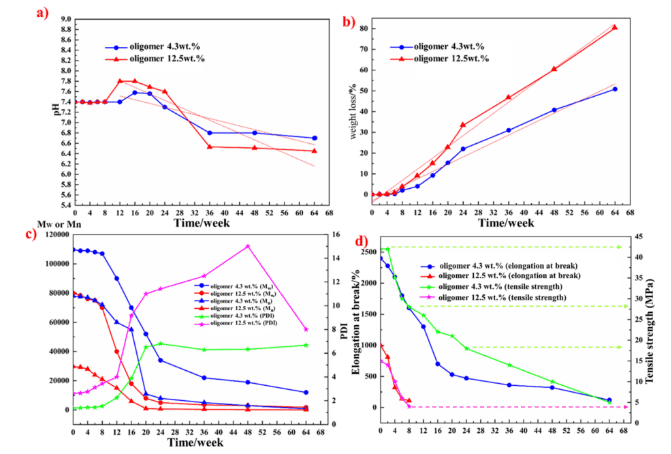 图3 不同低聚物含量的聚己内酯在降解过程中模拟体液pH值,失重、相对分子质量、机械性能的变化。