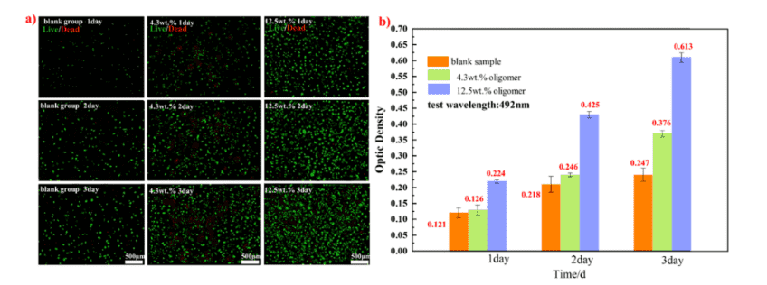 图5 不同低聚物含量的PCL表面细胞培养物的活/死细胞荧光染色照片; (b) MTT 测试结果。