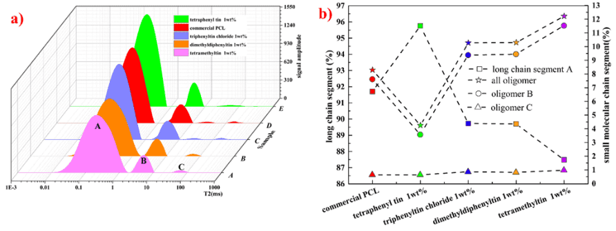 在前期工作中,课题组采用低场核磁技术分析了不同锡类催化剂和商业化聚己内酯的低聚物含量,并结合质谱分析部析了低聚物的具体组份,论文第一完成人龚彩红发现四苯基锡对聚己内酯分子量和综合性能的提升有积极作用,并在己内酯聚合过程中有效抑制了低聚物的产生,随后湖南大学瞿双林教授课题组对相关机理进行了理论计算,结果表明四本基锡催化己内酯开环聚合过程中形成了酸酐结构,从而有效抑制了低聚物的形成。相关论文Catalytic Regulation of Oligomers in Polycaprolactone(https://doi.org/10.1016/j.mcat.2021.111594)发表在《Molecular catalysis》。