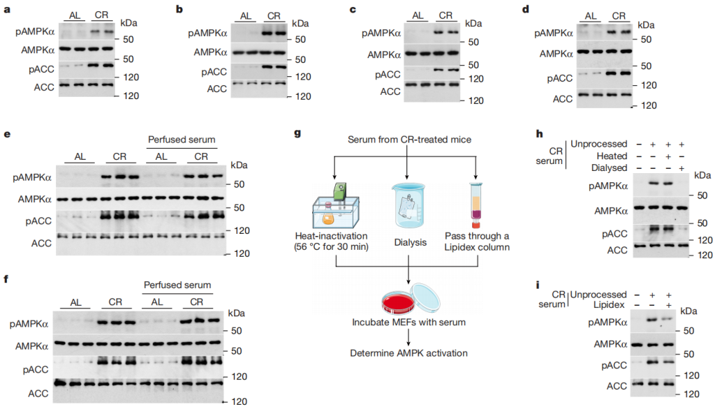 1.1图1a – 1d:用 CR 血清处理 MEFs、HEK293T 细胞、原代肝细胞和原代肌细胞4小时后,通过免疫印迹检测pAMPKα和pACC 水平,发现 CR 血清能激活这些细胞中的 AMPK,表明 CR 血清可在细胞水平模拟 CR 的部分效果。