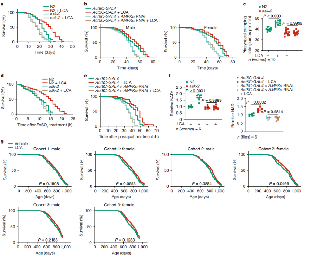 4.4 图4f:测定线虫和果蝇的 NAD⁺水平,发现 LCA 可使其增加,且该作用依赖于 AMPK。