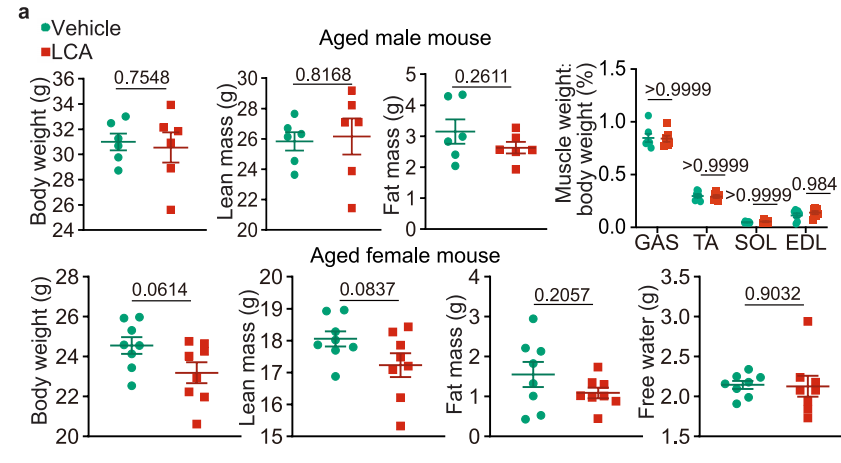 5.1 图5a LCA 可预防老年小鼠肌肉萎缩:对老年雄性和雌性小鼠进行实验,给它们喂食 (2 -羟丙基)-β -环糊精包被的 LCA(1g/L于饮用水中)1 个月后,LCA 处理组小鼠的肌肉质量与对照组相比,有明显的维持或增加趋势。这表明 LCA 能够有效防止老年小鼠因年龄增长而出现的肌肉萎缩情况,对肌肉健康具有积极的保护作用。除了肌肉质量,该分析仪的数据还显示,LCA 处理可能影响小鼠的脂肪体重和整体体重。虽然论文未对脂肪体重和体重变化进行详细讨论,但从身体成分测量的综合数据可以推测,LCA 可能通过某种代谢调节机制,对小鼠体内的脂肪积累或消耗产生影响,进而调节身体的脂肪与瘦体重比例,维持身体成分的平衡。