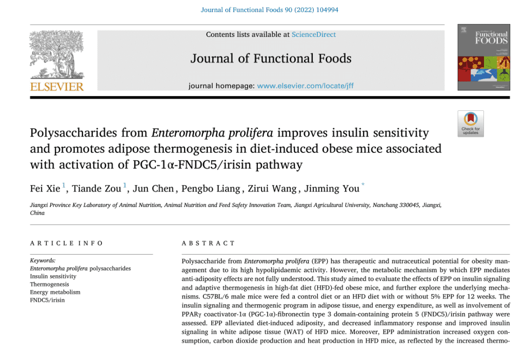 对此,江西农业大学动物与营养实验室谢飞,邹天德一行2022年发表于《Journal of Functional Foods》的《Polysaccharides from Enteromorpha prolifera improves insulin sensitivity and promotes adipose thermogenesis in diet-induced obese mice associated with activation of PGC-1a-FNDC5/irisin pathway》的文献揭示了,浒苔多糖可以防止哺乳动物高脂肪饮食引起的肥胖。证实了,浒苔多糖通过提高饮食诱导的肥胖小鼠的胰岛素敏感性并促进脂肪产热,从而发生能量消耗达到反肥胖反应的效果。
