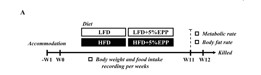 该文献研究者将实验小鼠随机分为4组,每组10只,分别为LFD(低肪饮食),HFD(高脂饮食);LFD+5%EPP(低肪饮食+5%浒苔多糖),HFD+5%EPP(高肪饮食+5%浒苔多糖)。实验设计如图2,