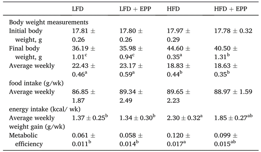 总之,在该研究中,间接测热系统表明,EPP引起的代谢活性增强和体脂率下降与增加身体的能量消耗有关。研究数据表明,膳食中补充EPP减少了脂肪和炎症,增强了胰岛素敏感性,以及棕色和米色脂肪的生成,从而改善了HFD小鼠的代谢健康。这些发现提示,EPP可以作为一种潜在的功能成分,抵消与不健康生活方式(高能量、高脂肪摄入和缺乏身体活动)相关的不良影响,即肥胖及肥胖引起的并发症。