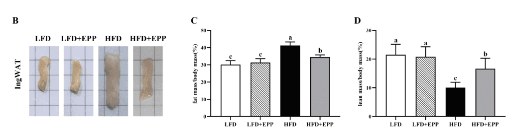 表1体重参数显示,经12周EPP处理后,HFD组小鼠的末次体重高于LFD组(23.24%,HFD与LFD比为44.60g与36.1g)和LFD+EPP组(23.96%,HFD与LFD+EPP比为44.60g与35.98g),HFD +EPP组小鼠的末次体重低于HFD组(9.19%,HFD与HFD+EPP比为44.60g与40.50g)。图3B显示所示,HFD组小鼠IngWAT的体重明显增加,EPP组小鼠的体重明显减少,与最终体重一致。