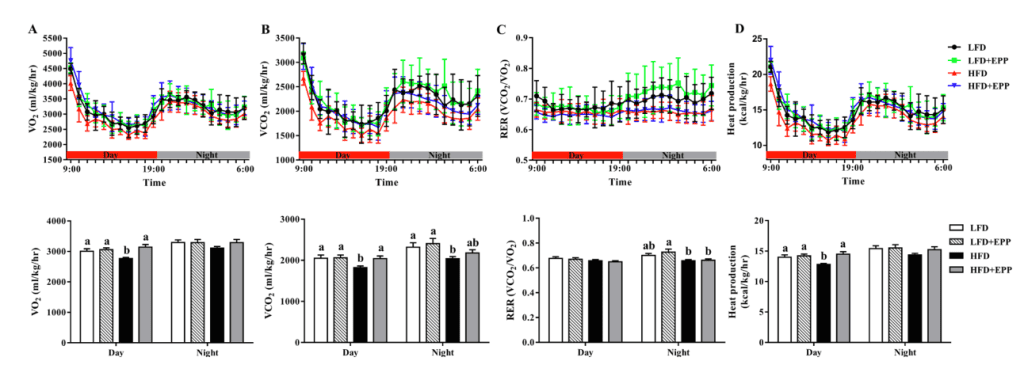 产量(VCO2)及其平均值。(C)根据代谢室数据计算呼吸交换比(RER、VCO2/VO2).(D)12h光-12h暗循环期间的产热量及平均值。结果表明:与高脂饮食组相比,EPP组小鼠在白天的耗氧量、二氧化碳产量和产热量均较高,夜间(活动期),高脂饮食小鼠的RER低于LFD+EPP小鼠。总之膳食EPP通过增加了高脂肪喂养的肥胖小鼠的能量消耗,从而达到预防饮食引起的肥胖。